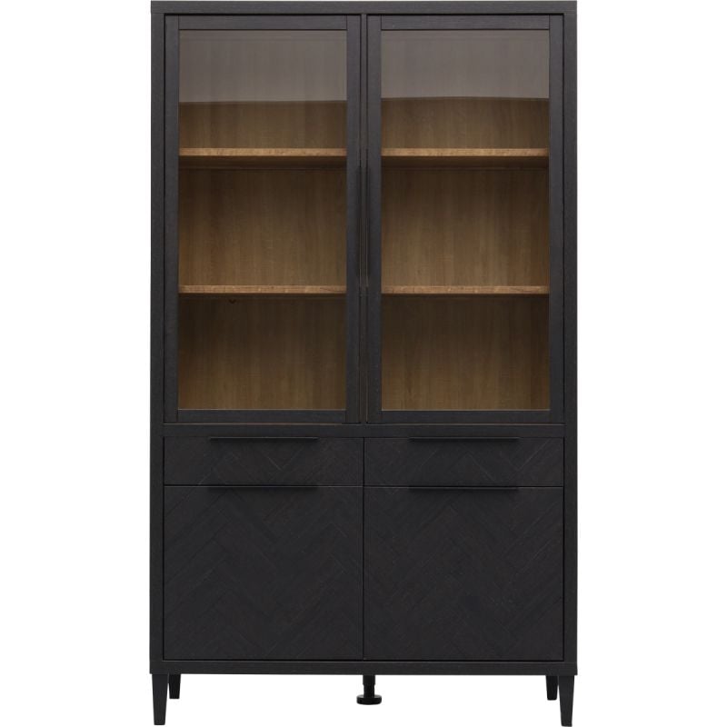 Vitrinekast Gaya is een elegante, robuuste buffetkast waarmee je kwalitatief design in huis haalt. Ben je dol op het chique visgraatpatroon? Dan is deze kast echt iets voor jou! Vitrinekast Gaya vormt een fantastisch statement in ieder modern interieur. De luxe looks van Gaya worden versterkt door een classy contrast. De binnenkant van de kast is namelijk naturel en de rest van de kast zo donkergrijs dat het zwart oogt. Net als de andere meubels uit serie Gaya is de vitrinekast gemaakt van melamine in houtlook. Door dit sterke materiaal ziet Gaya eruit als een massief houten kast, maar werkt niet, is in hoge mate resistent tegen krassen en makkelijk schoon te maken met een vochtige doek. Een onzichtbaar, maar o zo fijn detail is de softclose, waardoor lades en deuren van vitrinekast Gaya altijd rustig sluiten. Vitrinekast Gaya is praktisch met 6 vakken achter 2 glazen deuren, 4 achter dichte deuren en 2 lades. Prachtig als opbergkast in werkkamer of woonkamer of buffetkast in je