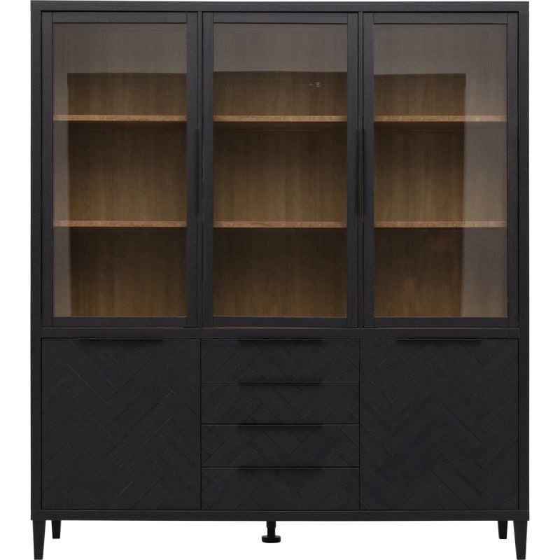 Vitrinekast Gaya 5-deurs is een elegante, robuuste buffetkast waarmee je kwalitatief design in huis haalt. Liefde voor het chique visgraatpatroon? Dan is dit helemaal jouw ding! Vitrinekast Gaya vormt een fantastisch statement in ieder modern interieur. De luxe looks van Gaya worden versterkt door een classy contrast. De binnenkant van de kast is namelijk naturel en de rest van de kast zo donkergrijs dat het zwart oogt. Net als de andere meubels uit serie Gaya is de vitrinekast gemaakt van melamine in houtlook. Door dit sterke materiaal ziet Gaya eruit als een massief houten kast, maar werkt niet, is het in hoge mate resistent tegen krassen en makkelijk schoon te maken met een vochtige doek. Een onzichtbaar, maar o zo fijn detail is de softclose, waardoor lades en deuren van vitrinekast Gaya altijd rustig sluiten. Vitrinekast Gaya is praktisch met 9 vakken achter 2 glazen deuren, 4 achter dichte deuren en 4 lades. Prachtig als opbergkast in werkkamer of woonkamer of buffetkast in je
